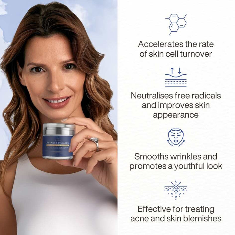 Retinol + Collagen + Hyaluronic Acid – A powerhouse trio that renews skin, boosts firmness, and locks in lasting moisture.
